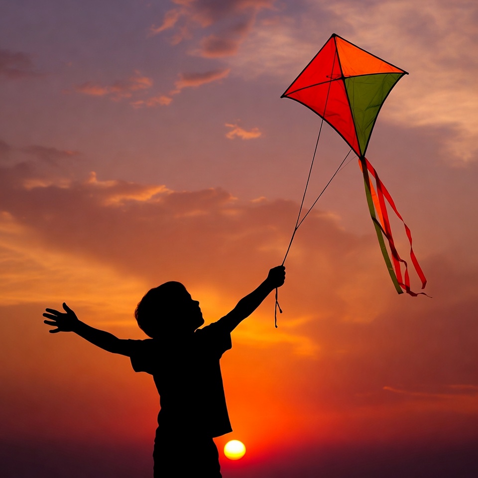 A silhouette of a young boy stands with arms outstretched, flying a colorful kite with red, green, and yellow panels and red ribbons. The scene is set against a vibrant sunset sky with orange and purple hues and a glowing sun on the horizon. The boy wears shorts and a shirt, captured in a joyful flying pose.