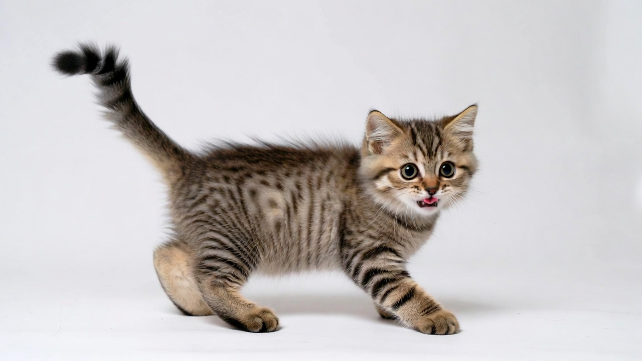 animal, baby cat, brown kitten, cat tail, cute kitten, fluffy kitten, isolated background, pet, pink tongue, playful kitten, raised tail, striped fur, tabby cat, tabby kitten, tongue out, walking kitten, white background, young cat, kitten