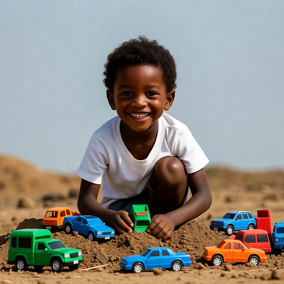 A young African boy with curly black hair smiles happily while playing with colorful toy cars on sandy ground. He wears a white t-shirt and green shorts, kneeling and holding a green toy truck. Various toy cars in green, blue, orange, and red surround him against a plain background.