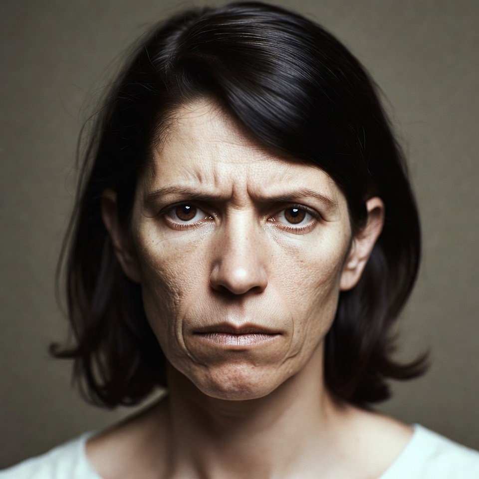 A woman with straight dark brown hair and fair skin stares directly at the camera with a furrowed brow and tense expression. Her dark eyes are narrowed, lips pursed, and cheeks slightly drawn in. She wears a white top against a plain neutral background.