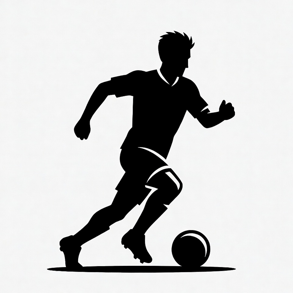 athlete, black silhouette, cleats, clipart, dynamic pose, football, illustration, isolated background, jersey, kicking ball, male, running, shorts, silhouette, soccer ball, sports, vector art, soccer player