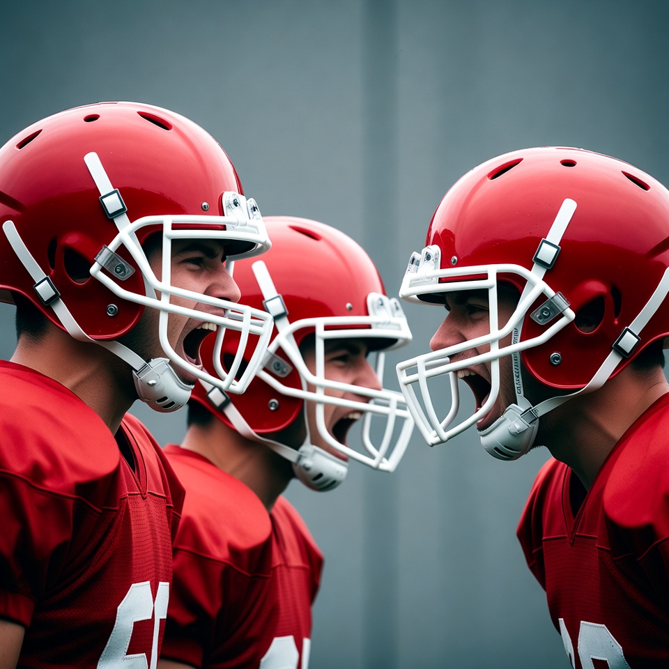 Four young men in red football jerseys and helmets stand close together facing each other against a gray wall. They wear intense expressions with open mouths as if shouting during a team huddle. White stripes accent their red helmets and shoulder pads.