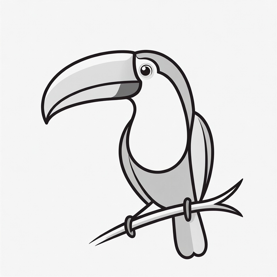 bird, branch, cartoon toucan, clipart, cute bird, gray bird, illustration, isolated, large beak, line art, perched bird, tropical bird, vector art, white background, toucan