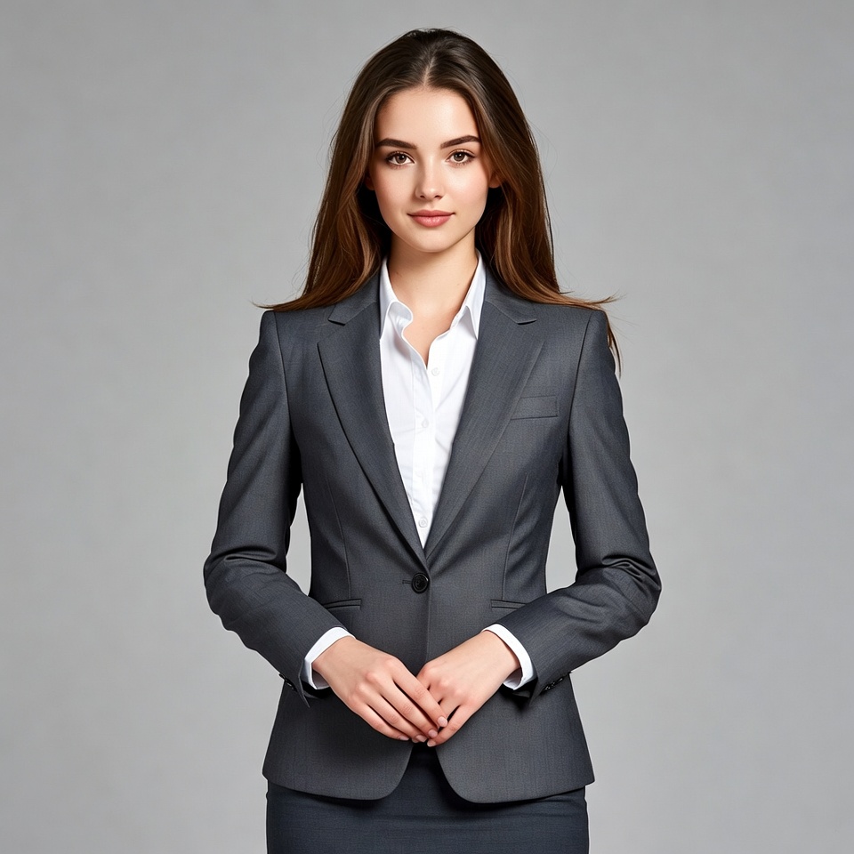 White, brown hair, business suit, businesswoman, corporate fashion, female, formal clothing, gray background, gray blazer, hands clasped, headshot, isolated background, long hair, office wear, pencil skirt, portrait, professional attire, standing pose, white shirt, young woman, woman