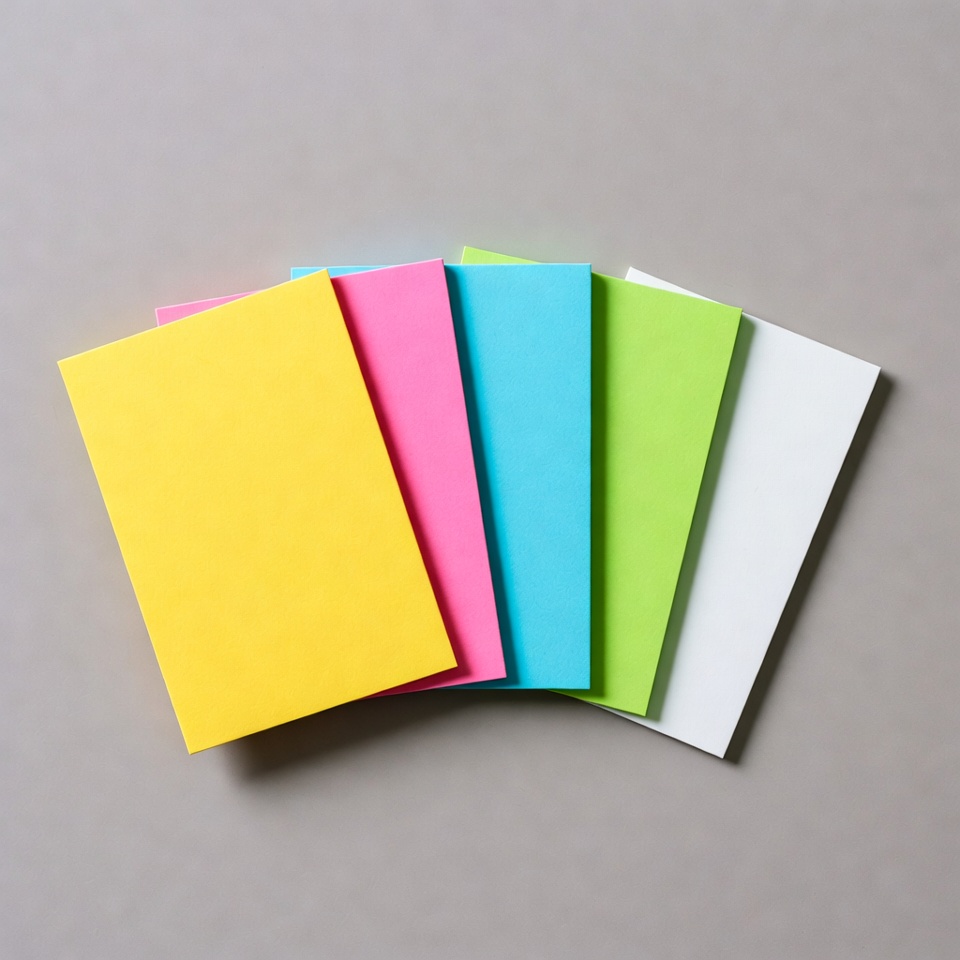 Five rectangular sticky notes in yellow, pink, cyan, green, and white are arranged in a fan shape. They are placed on a smooth gray surface. The notes have plain surfaces with no writing.