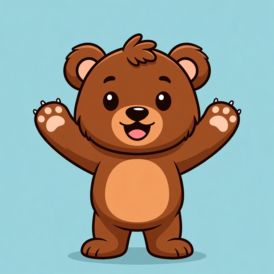 adorable animal, arms raised, baby bear, bear paws, big eyes, brown bear, cartoon bear, claws, clipart, fluffy fur, fun bear, happy bear, illustration, isolated background, kawaii bear, smiling bear, teddy bear, vector bear, waving bear, cute bear