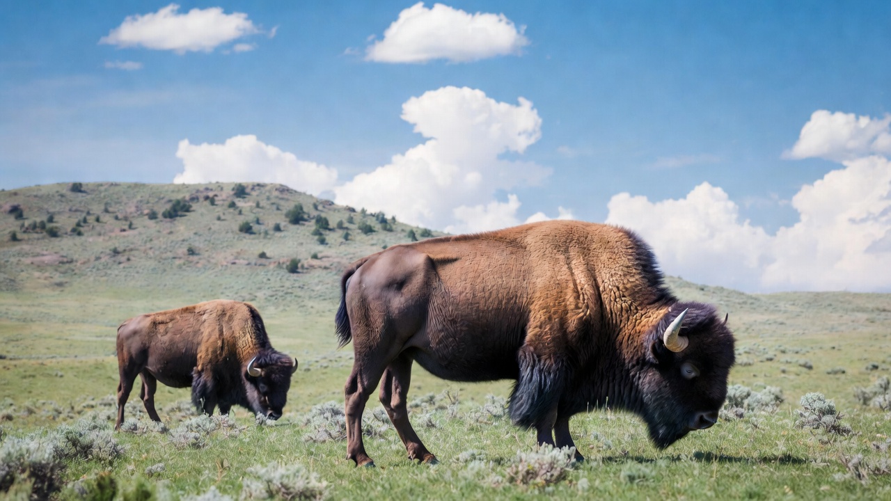 American bison, animals, blue sky, brown fur, buffalo, grassland, grazing, green grass, herd animals, hills, horns, nature, outdoors, plain, prairie, two bison, white clouds, wild animals, wildlife, bison