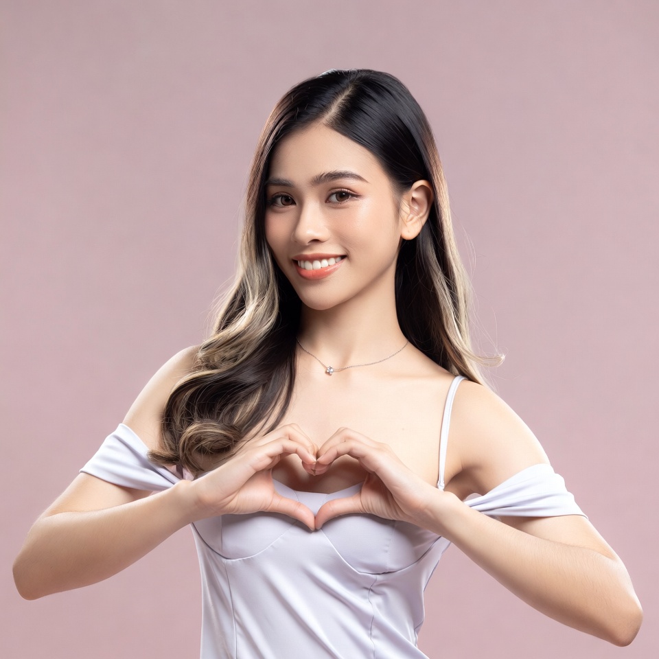 A young Asian woman with long wavy black hair streaked with blonde stands against a pink background. She wears an off-shoulder white top and smiles while forming a heart shape with her hands over her chest. Her necklace with a small pendant is visible.