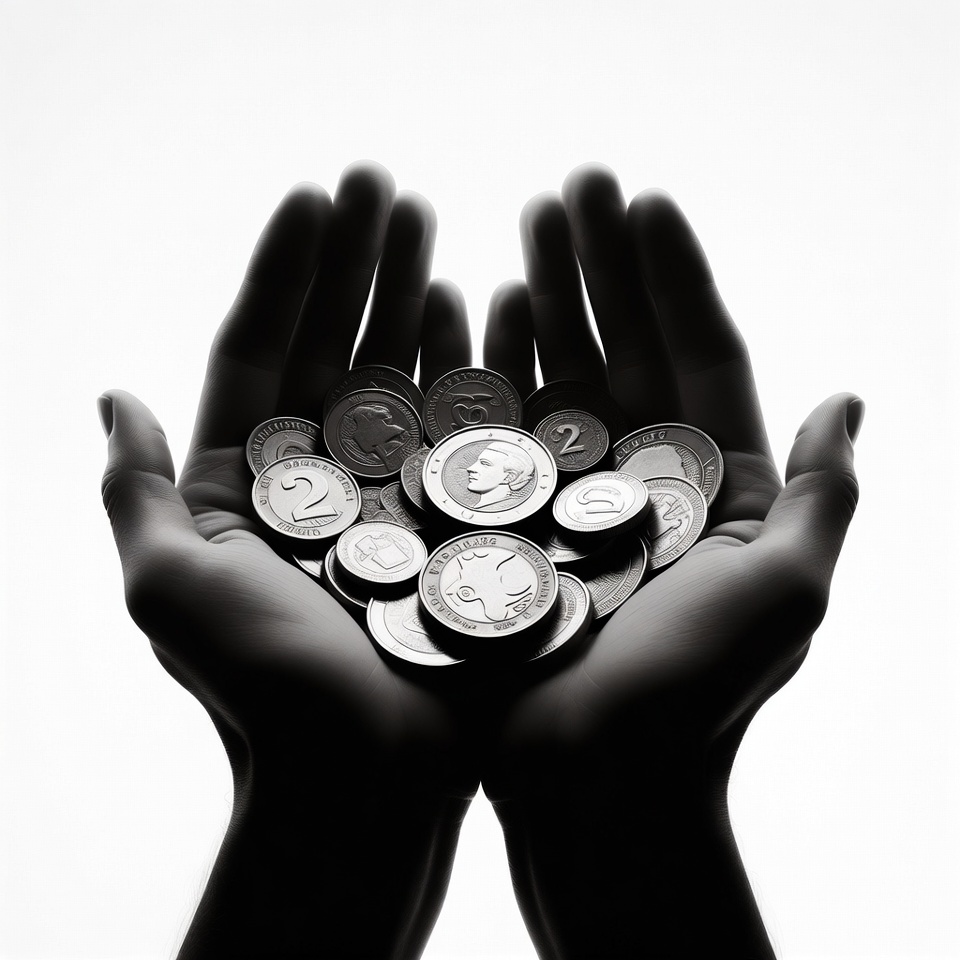 A pair of open hands holds a collection of silver coins with various designs, including some featuring the number 2. The image is in black and white with a plain white background, emphasizing the metallic coins and dark hand shadows. The coins are piled centrally in the palms.