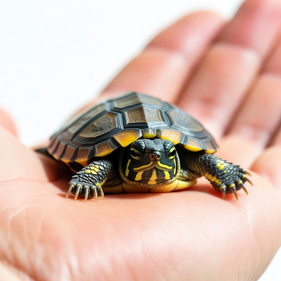 A small baby turtle with dark shell and yellow markings rests in an open human hand. The turtle faces forward with its head extended, showing detailed facial features and tiny claws. The hand is positioned against a plain white background.