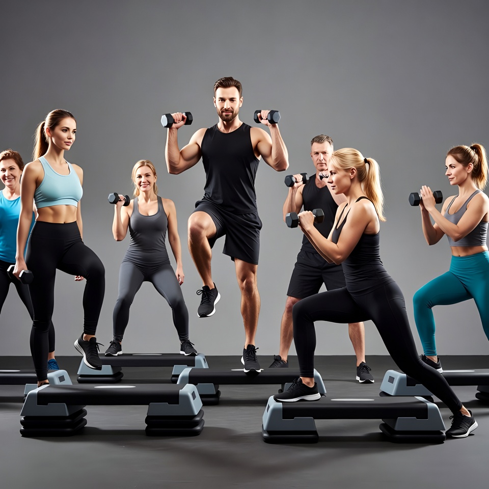 White, aerobic class, athletic wear, black platform, cardio workout, dumbbells, dynamic pose, exercise group, fitness instructor, gray background, group exercise, gym workout, indoor gym, leggings, lifting weights, men, muscular man, ponytail women, sports bra, step platform, strength training, tank top, team training, women, fitness class