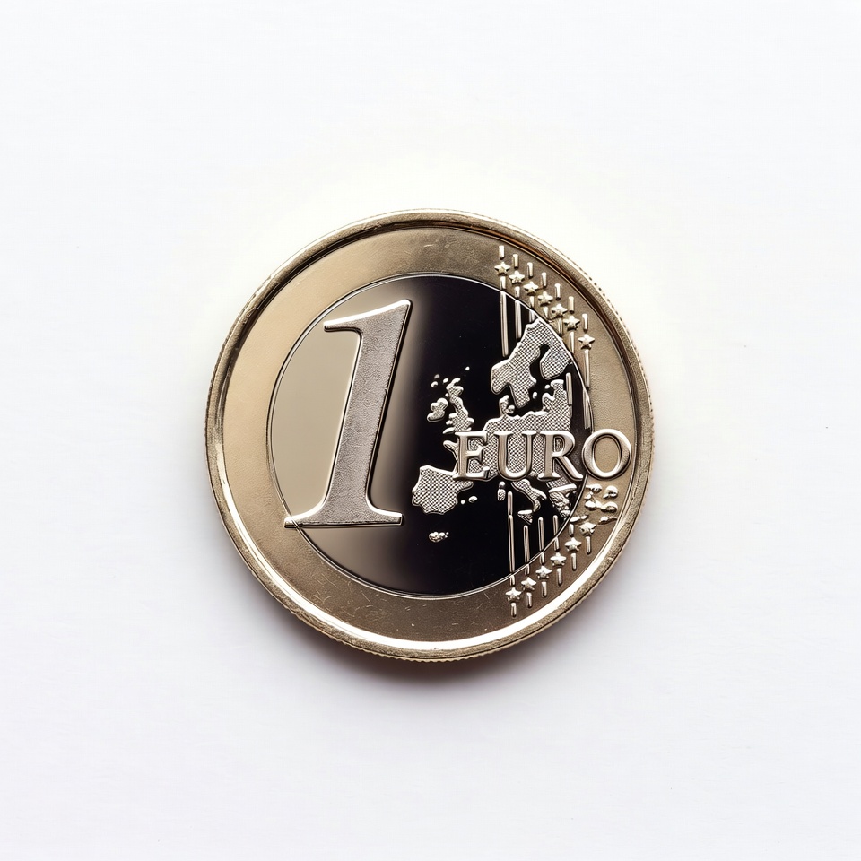 A close-up view of a 1 Euro coin on a white background. The coin features a gold outer ring and a silver center with the number '1' and the word 'EURO'. The center also displays a map of Europe with architectural elements.