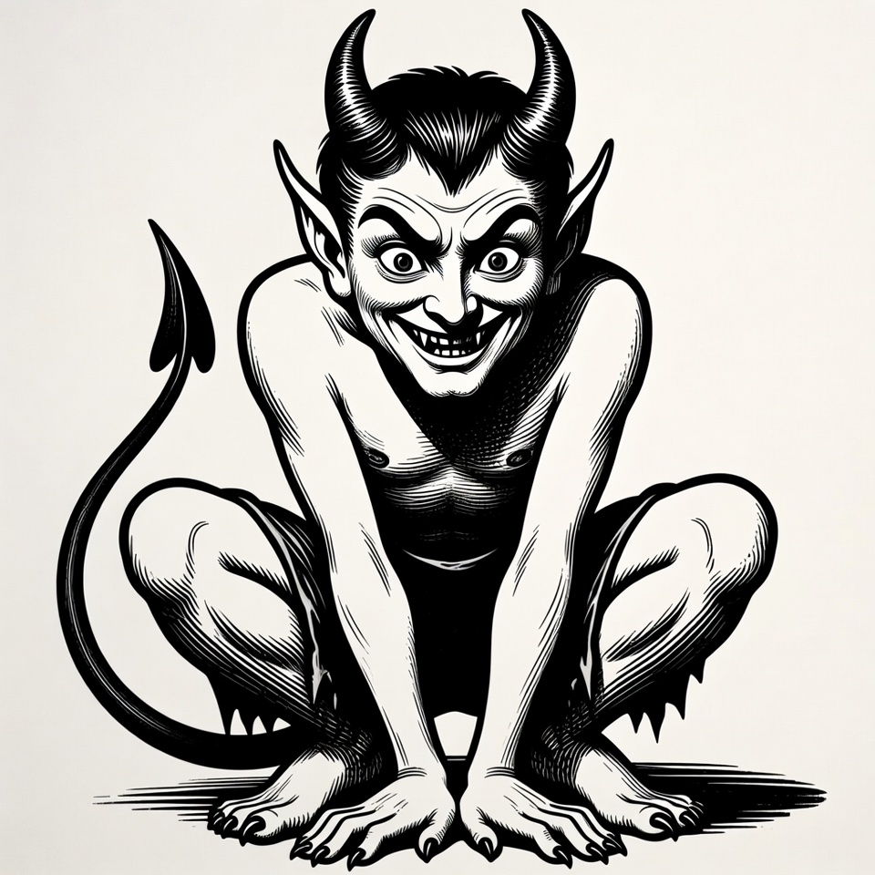 A black and white line art illustration depicts a mischievous cartoon devil with curved horns, pointed ears, and a long tail. The devil squats with knees bent, arms extended forward, and a wide toothy grin on its snarling face. It has clawed hands and feet, set against an isolated white background.