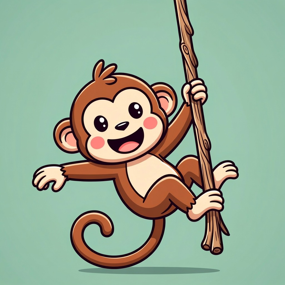 A cute cartoon monkey with big sparkling eyes and rosy cheeks swings happily on a wooden branch. It has brown fur, a long curly tail, and light belly, set against a solid teal background. The monkey grips the branch with both hands and feet while smiling widely.