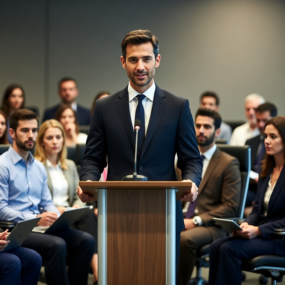 White man, audience, business meeting, business suit, conference, conference room, corporate event, diverse crowd, gray walls, listeners, men, microphone, notebooks, podium, professional attire, public speaking, seated audience, tablets, tie, women, wooden podium, man speaking