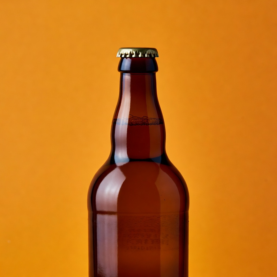 alcohol, amber bottle, beer, beverage, bottle cap, brown bottle, craft beer, drink, glass bottle, gold cap, isolated, longneck bottle, orange background, studio shot, beer bottle