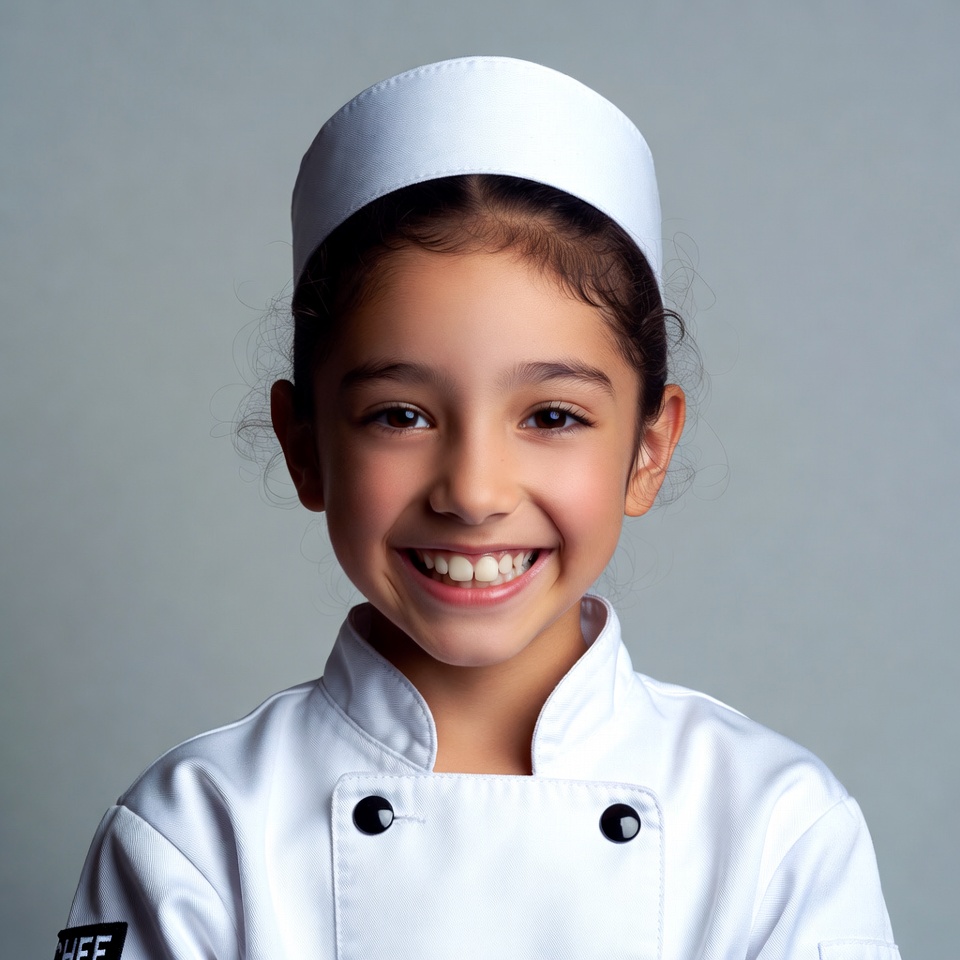 A young girl with curly dark hair smiles happily while wearing a white chef uniform and hat. She stands against a plain gray background with 'CHEF' printed on her sleeve. Her eyes are bright and she shows her teeth in a wide grin.