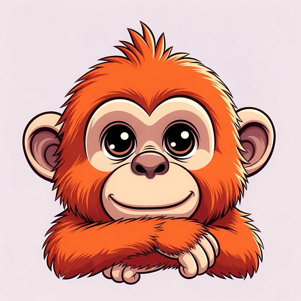 animal, arms crossed, big eyes, cartoon, clipart, cute, fluffy fur, happy face, illustration, isolated background, kawaii, orange fur, primate, smiling, vector art, orangutan