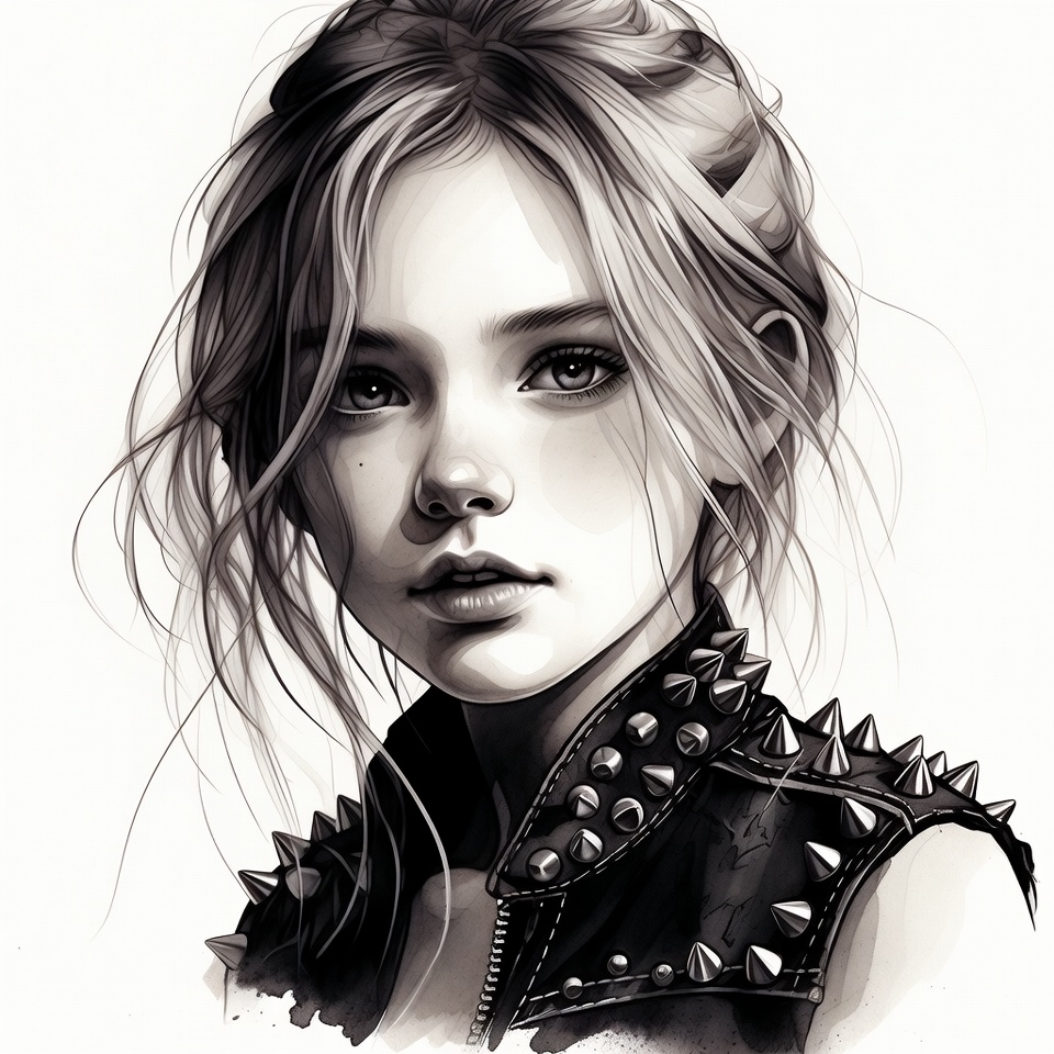blonde hair, closeup, digital art, eyes, face, female, illustration, leather jacket, lips, portrait, realistic drawing, spikes, studded vest, white background, young woman, girl
