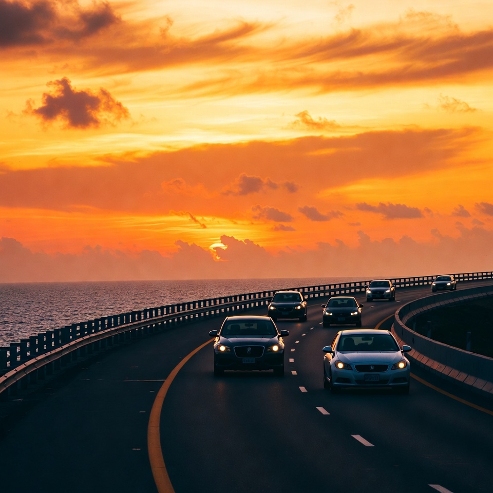 Multiple cars drive along a curved bridge over the ocean during a vibrant orange sunset. The sky is filled with dramatic clouds reflecting warm hues of orange and yellow. Silhouetted vehicles move on the road with guardrails and sea visible on both sides.