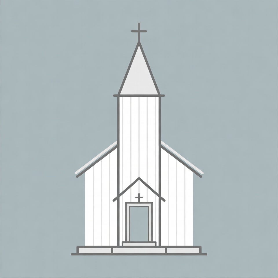 A simple line drawing of a white church with a tall steeple and cross on top. The church features vertical siding, a front door, and a gabled roof, all outlined in white against a light gray background. It stands on a small base with an isolated, minimalist design.