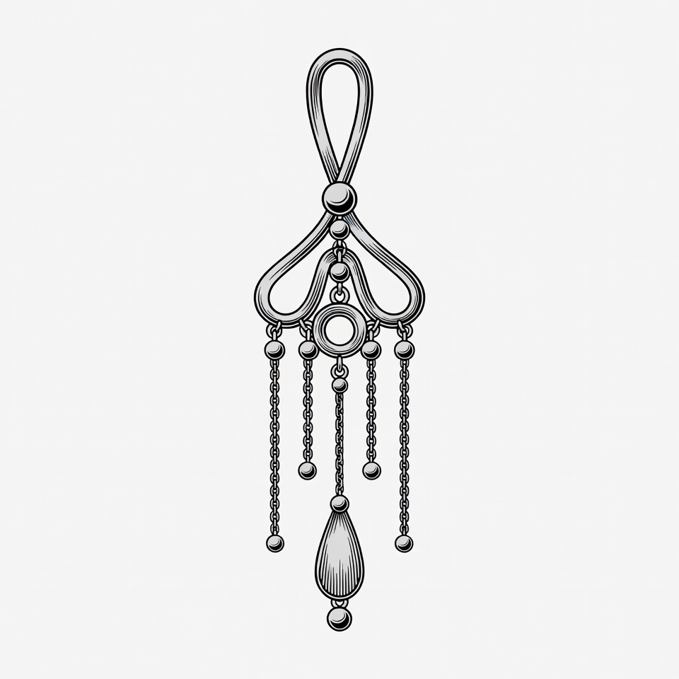 A detailed line art illustration of a silver pendant necklace on an isolated white background. The pendant features an elegant looped top, intricate triangular design with circular elements, dangling chains, and a teardrop gem at the bottom.