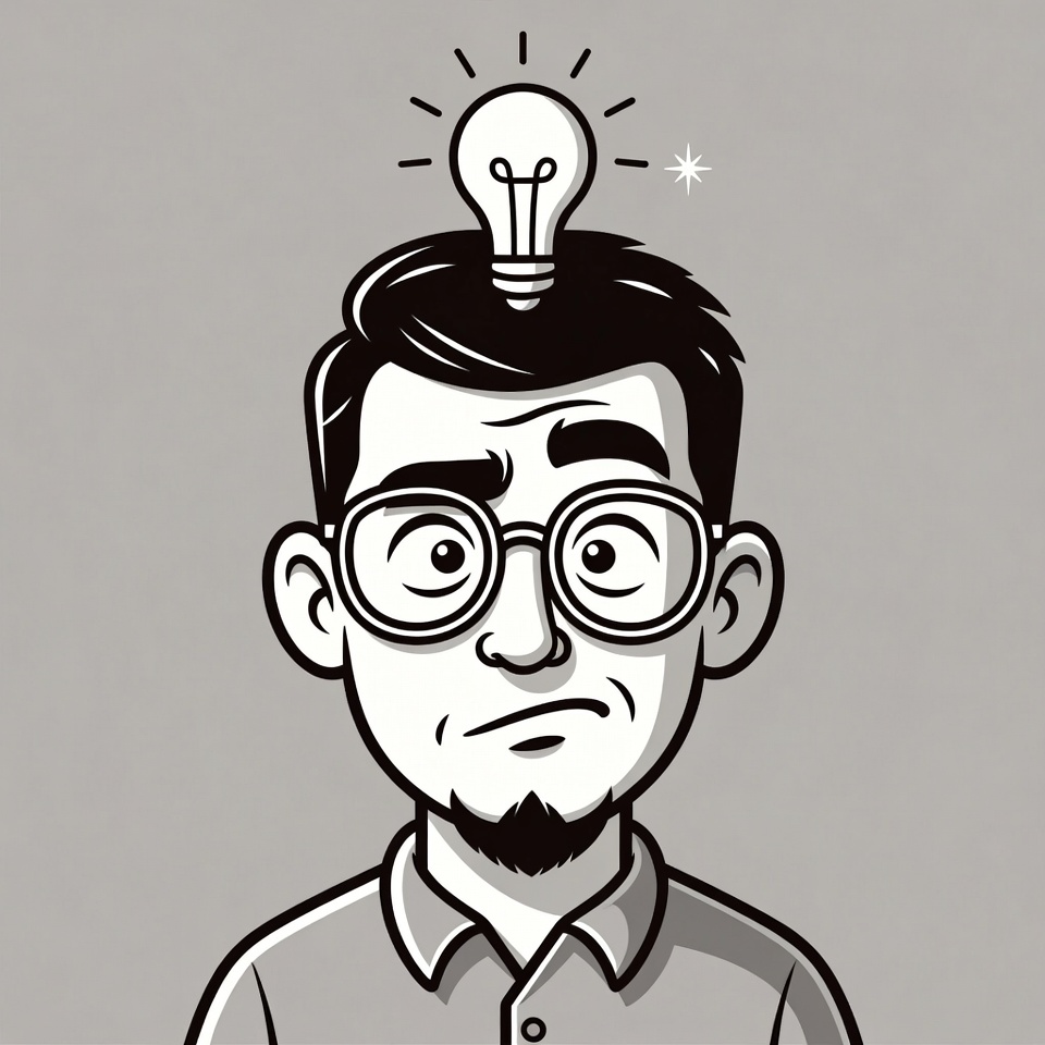 A cartoon illustration depicts a young Asian man with short black hair, glasses, and a goatee, looking puzzled. A glowing lightbulb with sparkles sits atop his head against a gray background. He wears a collared shirt and has a concerned expression.