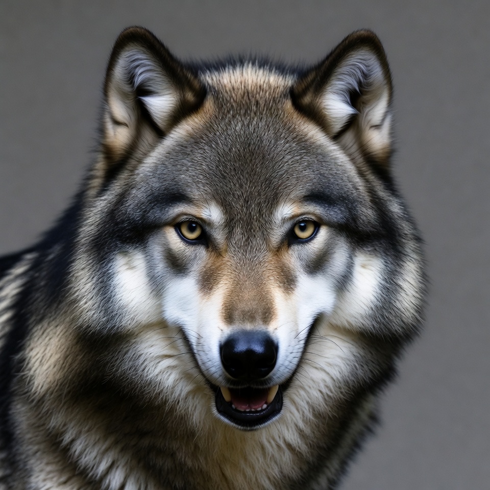 A gray wolf with thick fur in shades of brown, gray, and black stares directly at the camera with intense yellow eyes. Its mouth is slightly open, revealing teeth, and it has prominent pointed ears. The wolf is centered against a plain gray background.