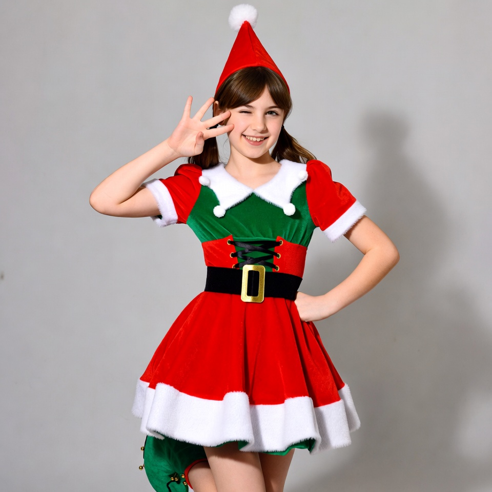 A young girl with brown hair in pigtails wears a festive red and green elf dress with white trim, a matching hat with pom-pom, and green shoes. She poses playfully with a peace sign hand gesture and winking expression against a plain gray background. The outfit features a black belt and puffed sleeves.