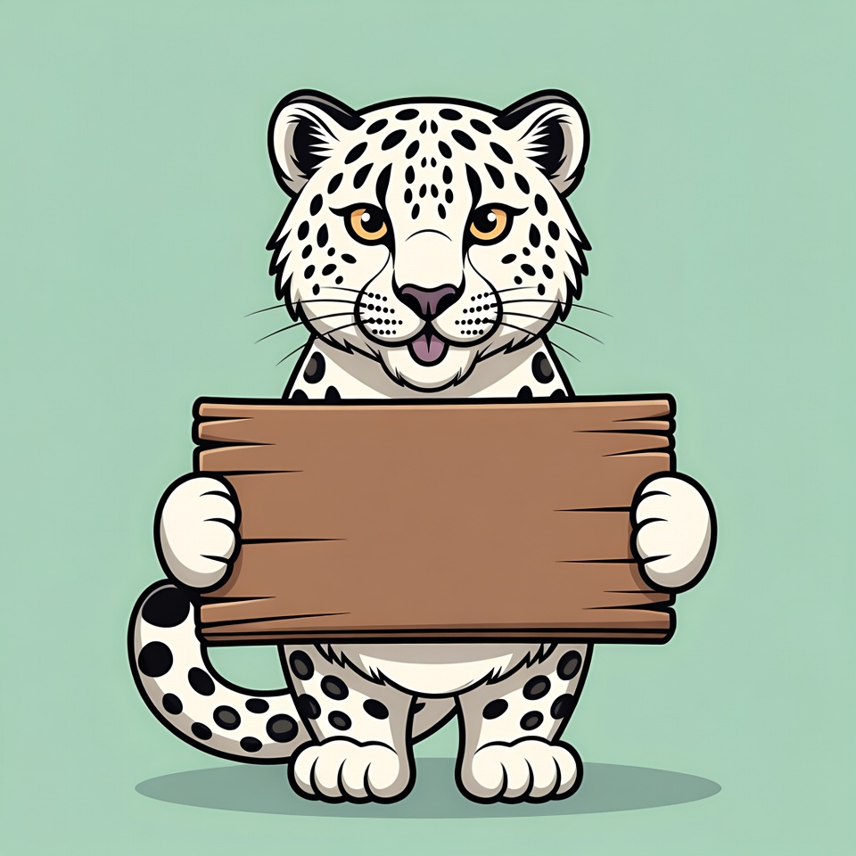 A cute cartoon snow leopard with white fur and black spots stands on all fours holding a blank wooden sign with its front paws. The snow leopard has large expressive yellow eyes, a smiling mouth with tongue out, and a fluffy tail. It is illustrated in a kawaii style against a light green background.