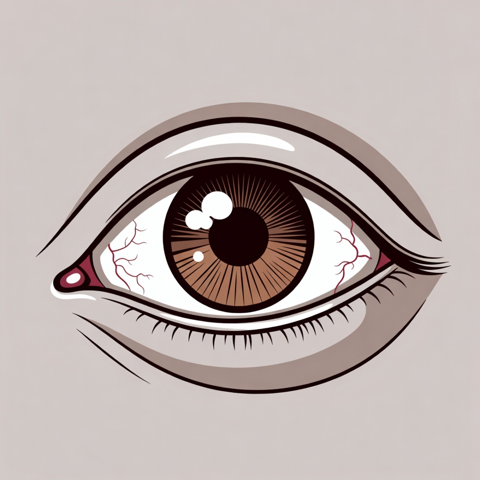 A close-up illustration of a human eye with a rich brown iris and visible white sclera. Red blood vessels are prominent around the iris, and the eye is outlined with subtle eyelashes. The artwork features a smooth gray background.