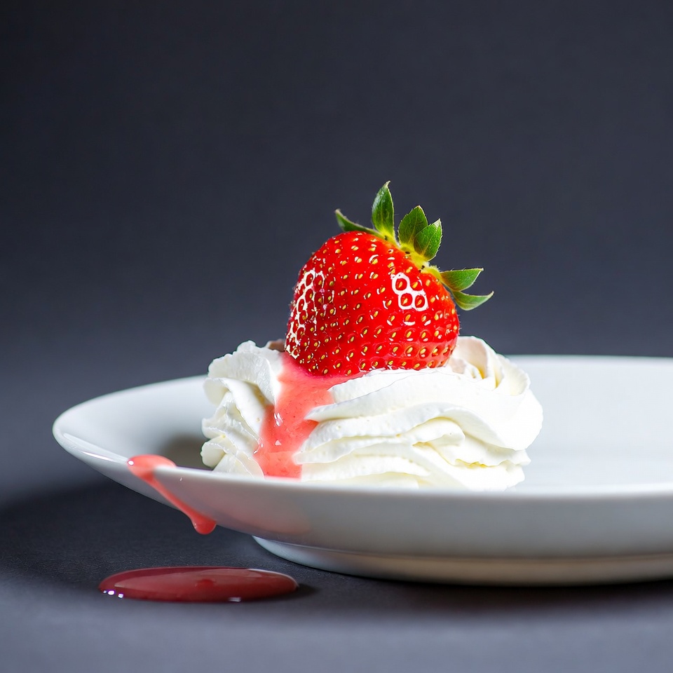 berry dessert, cream swirl, dessert, food photography, fresh fruit, gourmet dessert, isolated background, red strawberry, strawberry sauce, sweet treat, whipped cream, white plate, strawberry