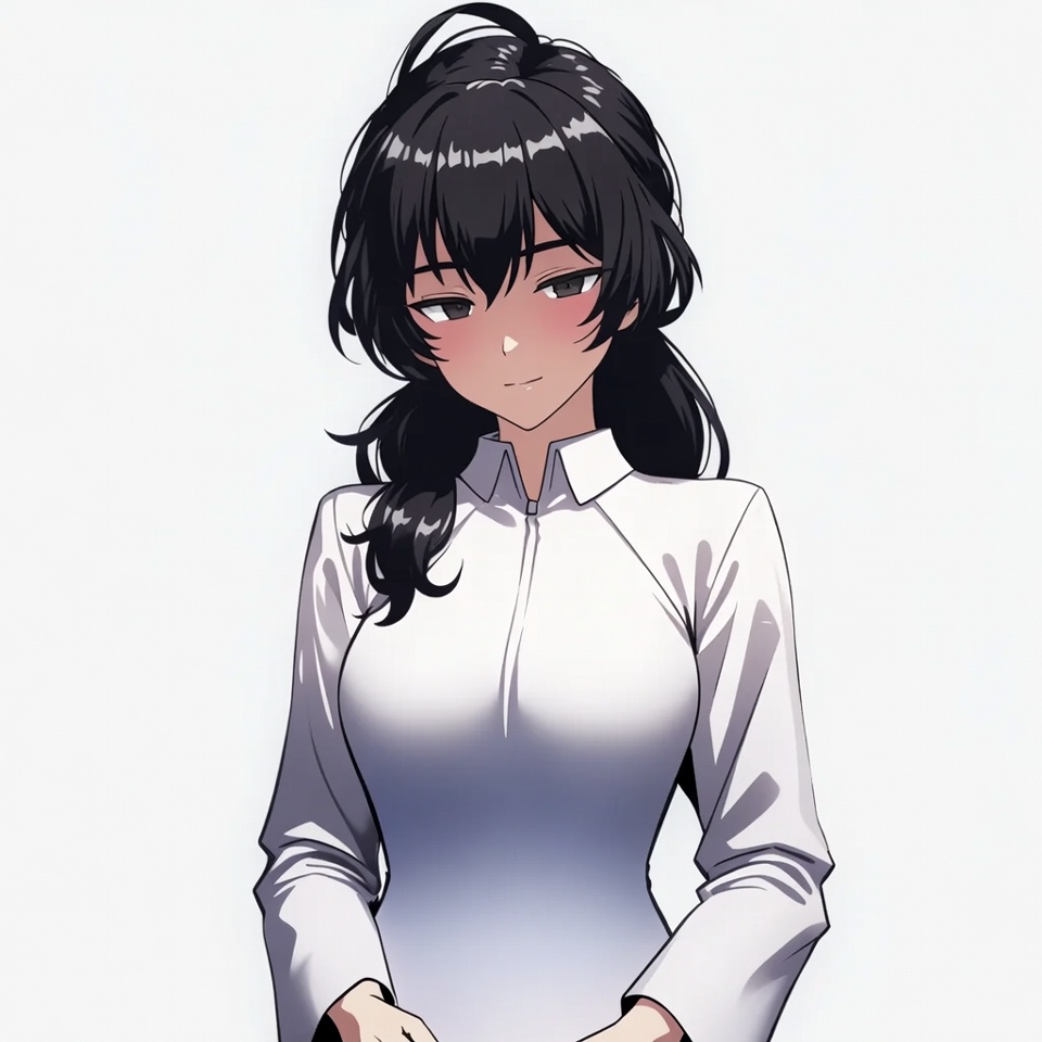 Asian, anime, black hair, cute anime, female character, flushed cheeks, girl, illustration, isolated background, large breasts, long hair, manga style, ponytail, shy expression, tight shirt, white shirt, zipper shirt, anime girl
