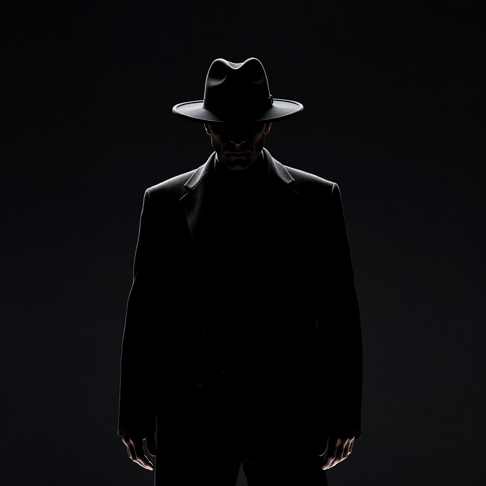 black suit, dark background, dramatic lighting, fedora hat, formal wear, hat, isolated background, male, mysterious, noir style, profile, shadow, silhouette, standing, suit jacket, turtleneck, man