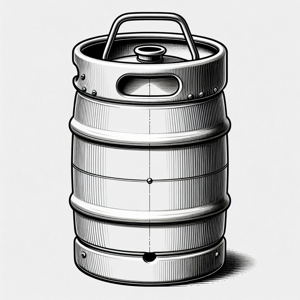 beer barrel, brewery, clipart, draft beer, engraving style, handle, illustration, isolated background, keg, line art, metal keg, rivets, stainless steel, tap valve, beer keg