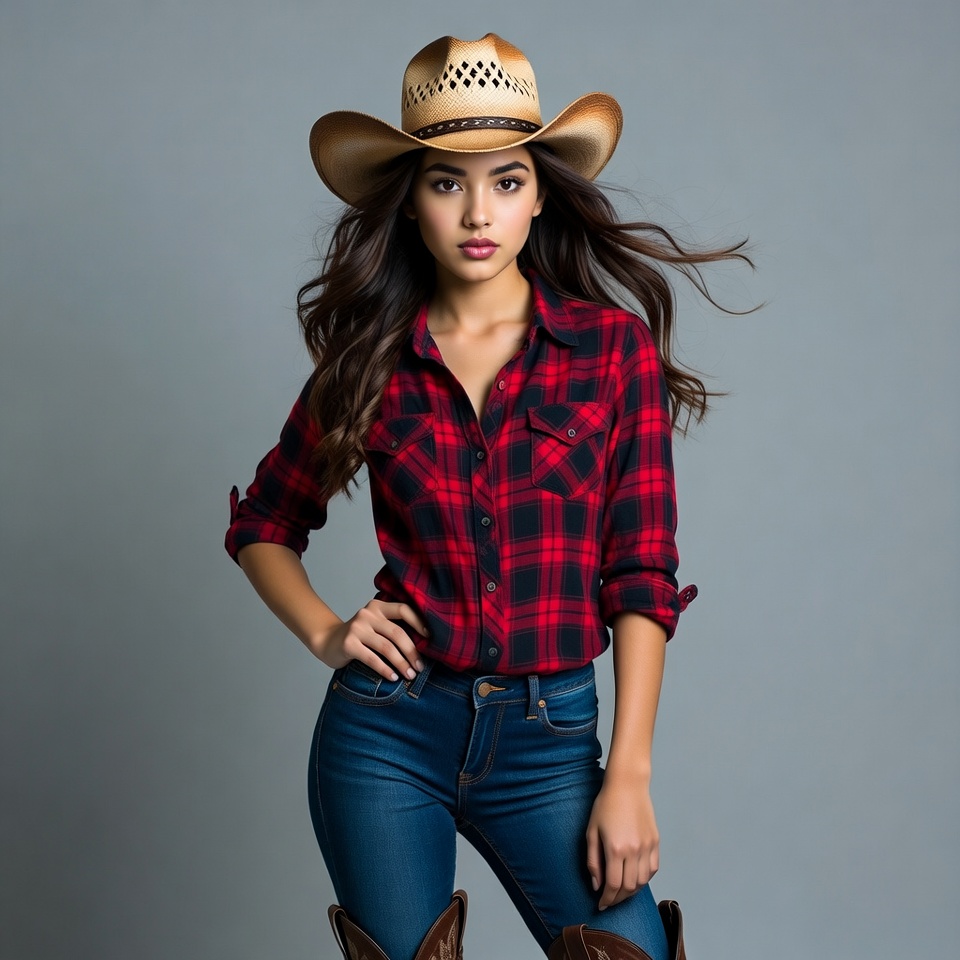 Latina, blue jeans, confident pose, country girl, cowboy boots, cowboy hat, cowgirl, dark hair, fashion, gray background, hands on hips, isolated background, long hair, plaid shirt, posing, red plaid, stylish woman, western style, young woman, woman