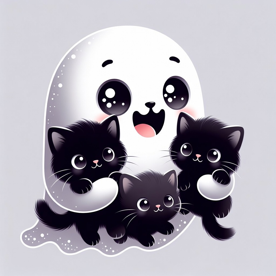 A cute white ghost with big sparkling eyes happily hugs three adorable black kittens. The kittens have large eyes and are nestled in the ghost's ethereal arms against a light gray background. The illustration features kawaii style with soft shading and playful expressions.