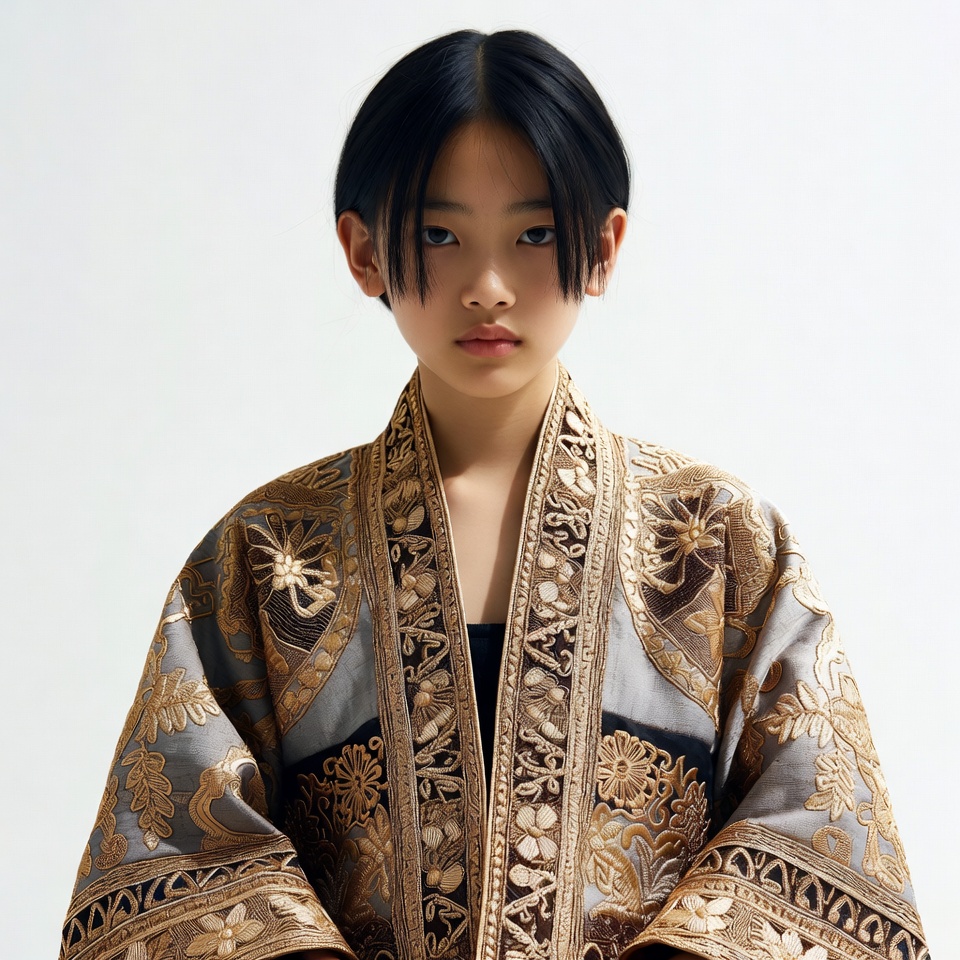 Asian, bangs, black hair, cultural attire, embroidery, fashion, female, floral design, gold patterns, gray fabric, isolated background, kimono, ornate robe, portrait, serious expression, standing pose, straight hair, traditional clothing, young girl, girl