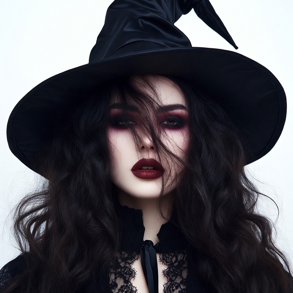 A woman with long wavy black hair wears a tall black witch hat and dark gothic makeup. She has striking dark eyeliner and deep red lipstick, with hair blowing across her face. She is dressed in a black lace-collared top against a white background.