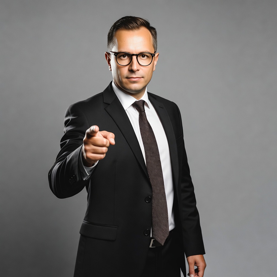 A middle-aged White man with short dark hair and glasses stands against a gray background. He wears a black suit, white shirt, and brown tie. He points directly forward with his right hand extended.