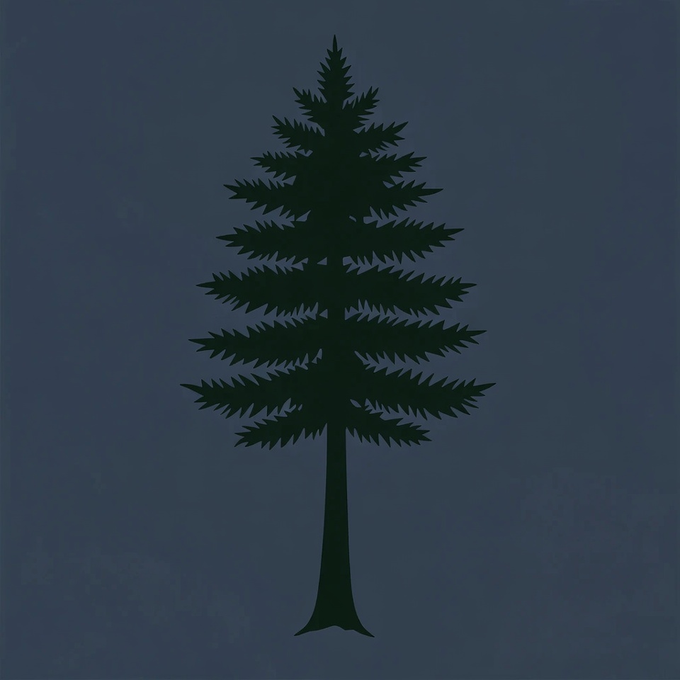 A dark silhouette of a tall pine tree with dense needle branches stands against a deep navy blue background. The tree features a straight trunk tapering to a pointed top. The image is a simple vector-style illustration isolated on a solid color background.