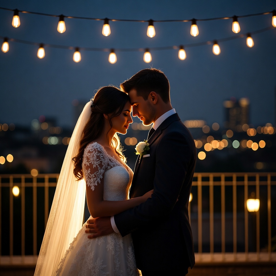 A bride in a lace wedding gown with a long veil embraces a groom in a black tuxedo on a balcony at night. Warm string lights hang above them, illuminating their close embrace against a city skyline with distant buildings and lights. The scene features a romantic rooftop setting with a metal railing.