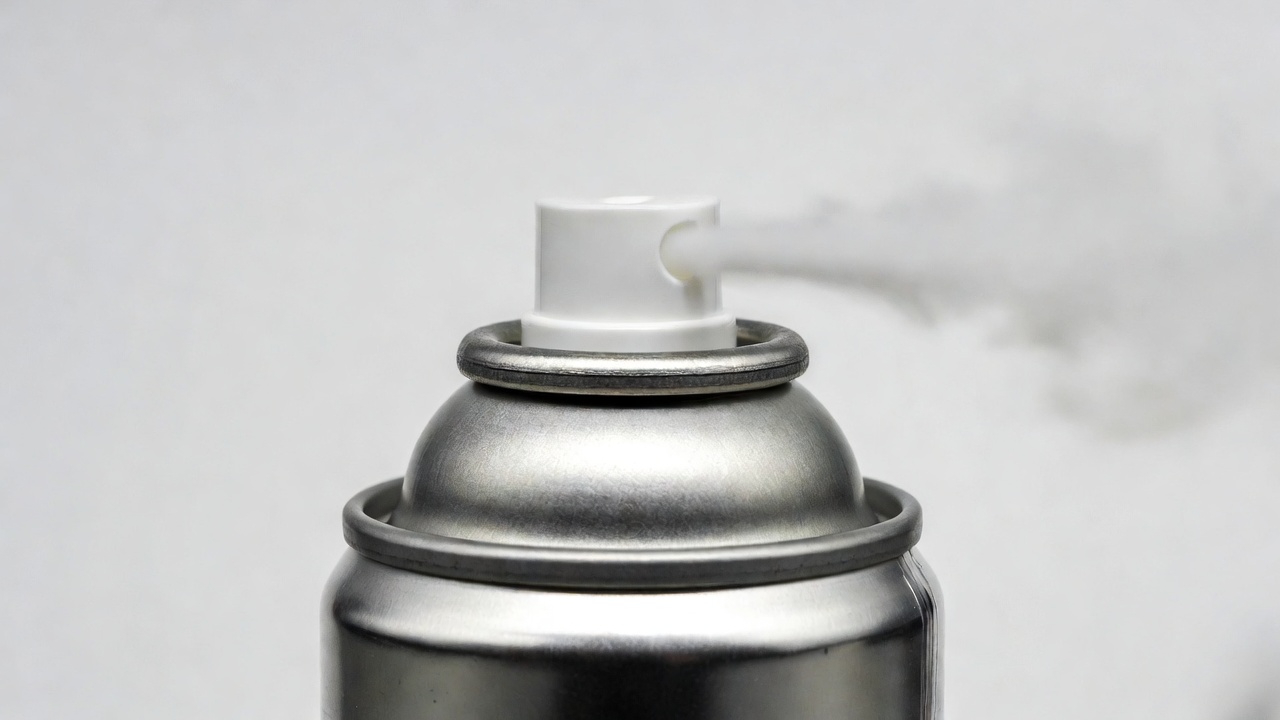 aerosol can, air spray, close-up, fog spray, isolated background, metallic spray, nozzle, product shot, silver can, spray paint, spraying, white background, white cap, white mist, spray can
