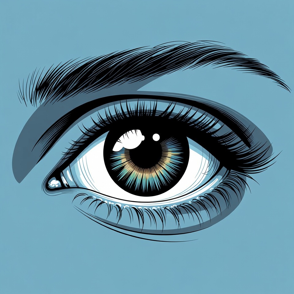 A close-up illustration of a human eye with a striking blue iris featuring multicolored highlights. Thick black eyelashes frame the eye, and fine dark eyebrows arch above it. The artwork is set against a solid blue background.