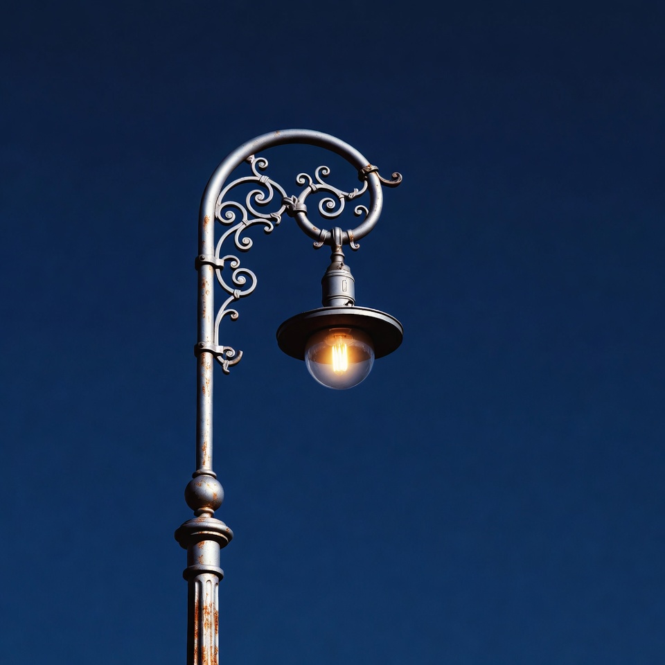 A tall ornate vintage street lamp stands against a deep blue night sky. The lamp features intricate curved metalwork and a glass globe emitting a warm yellow glow from its bulb. The aged silver pole and decorative flourishes add a classic architectural charm.