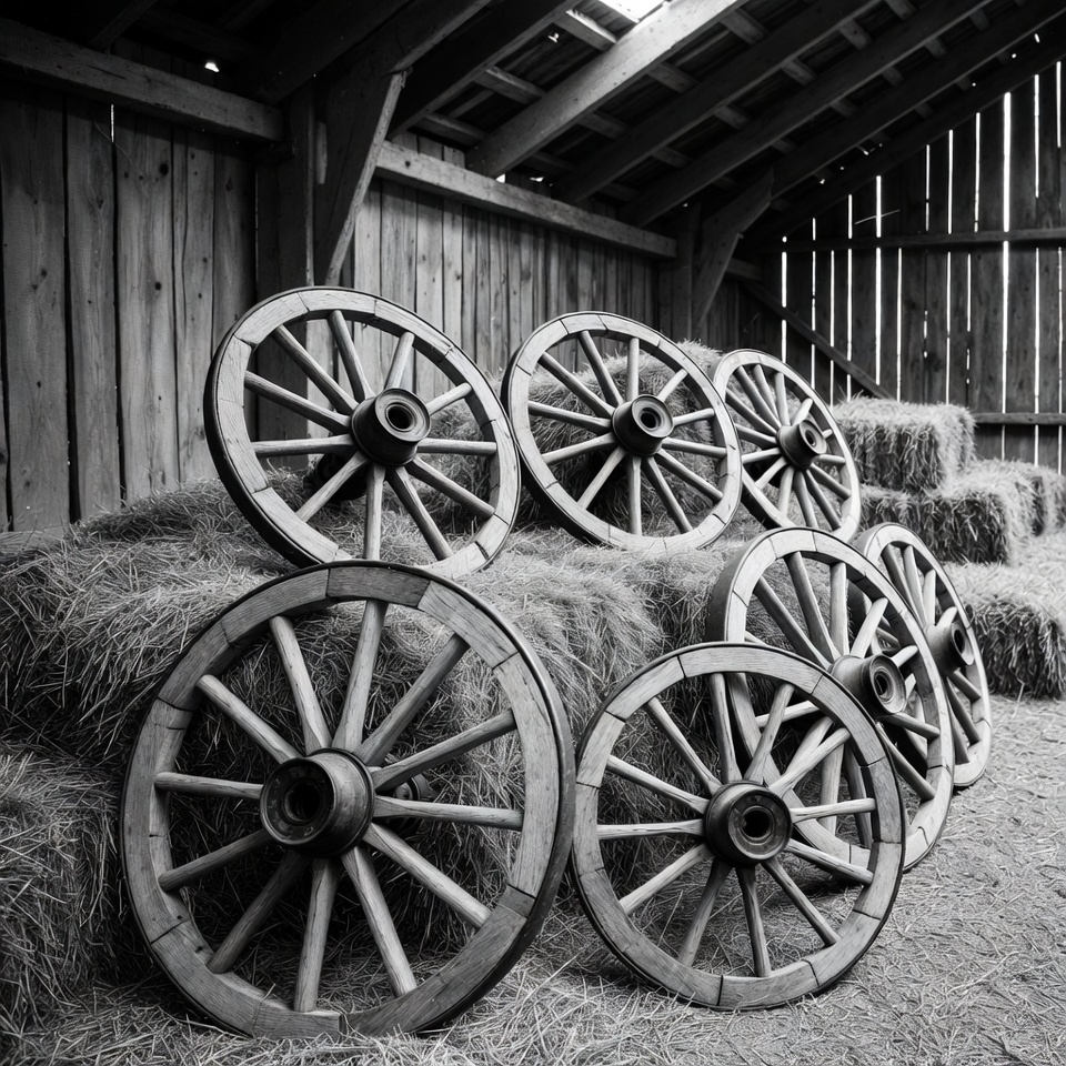 Stacked Wooden Cart Wheels on Hay Bales