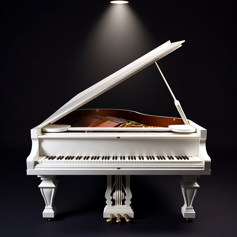 A white grand piano with its lid open stands on a dark background, illuminated by a bright spotlight from above. The piano features black and white keys, ornate legs, and brass pedals. The warm light highlights the instrument's curves and details.