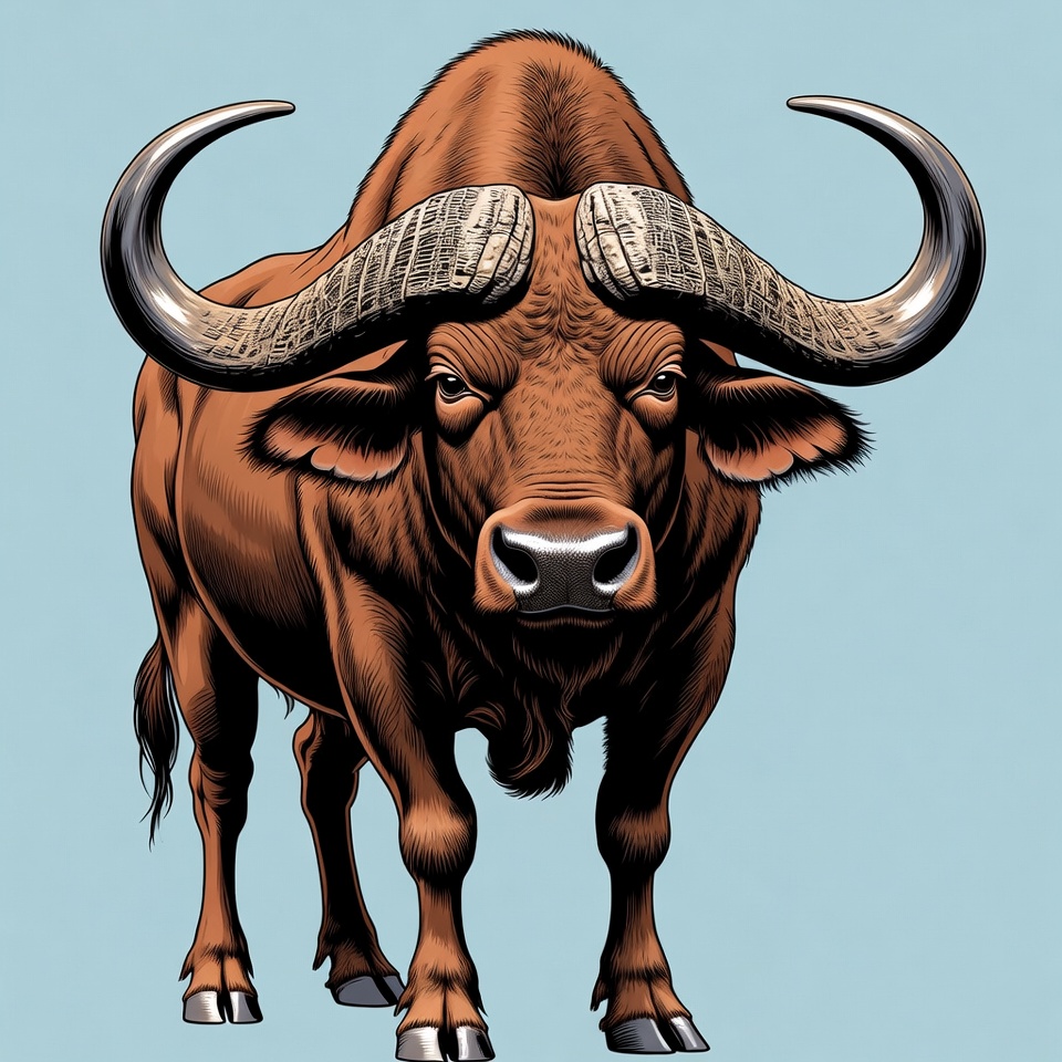 African buffalo, animal, blue background, brown buffalo, clipart, curved horns, detailed drawing, horns, illustration, large horns, mammal, shaggy fur, standing buffalo, wildlife, buffalo