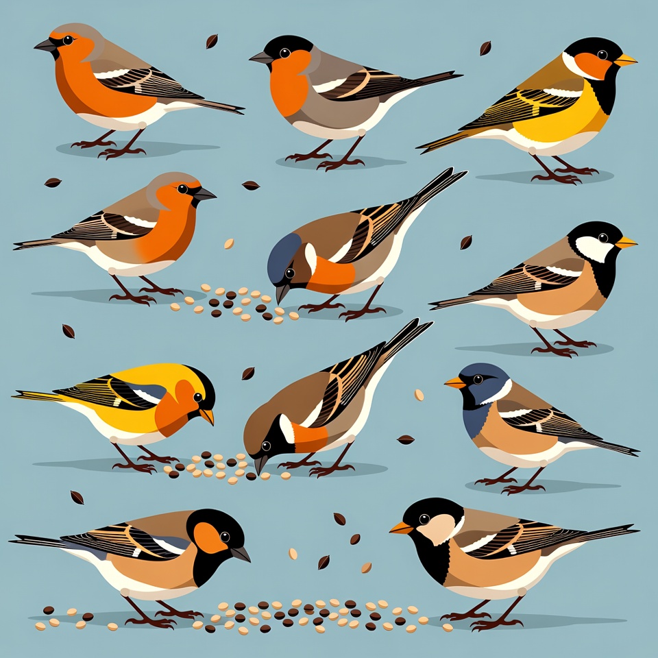 A collection of nine illustrated bullfinches in various colors perch and eat scattered seeds on a light blue background. The birds feature vibrant plumage including red, orange, yellow, black, and white feathers. They are depicted in different poses, some standing and others pecking at the seeds.