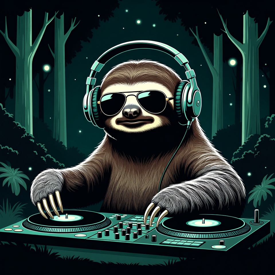 A cute sloth wearing oversized green headphones and sunglasses DJs at turntables in a glowing neon jungle forest. Surrounded by dark trees, fireflies, and palm leaves, the sloth has a relaxed smile and fluffy brown fur. The vibrant illustration features glowing green and purple hues on an isolated background.